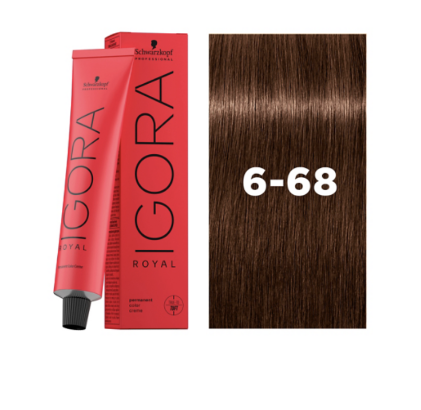 Crema colorante permanente IGORA ROYAL 6-68 Rubio Oscuro Chocolate Rojo con cobertura de hasta el 70% de canas. Puede utilizarse en todas las técnicas de coloración. Proporciona una dirección de tono chocolate rojo. La Tecnología High Definition de IGORA ROYAL ofrece una matriz de pigmentos de alta definición para un color más puro, resultados fieles a la carta, intensidad amplificada y máxima cobertura.